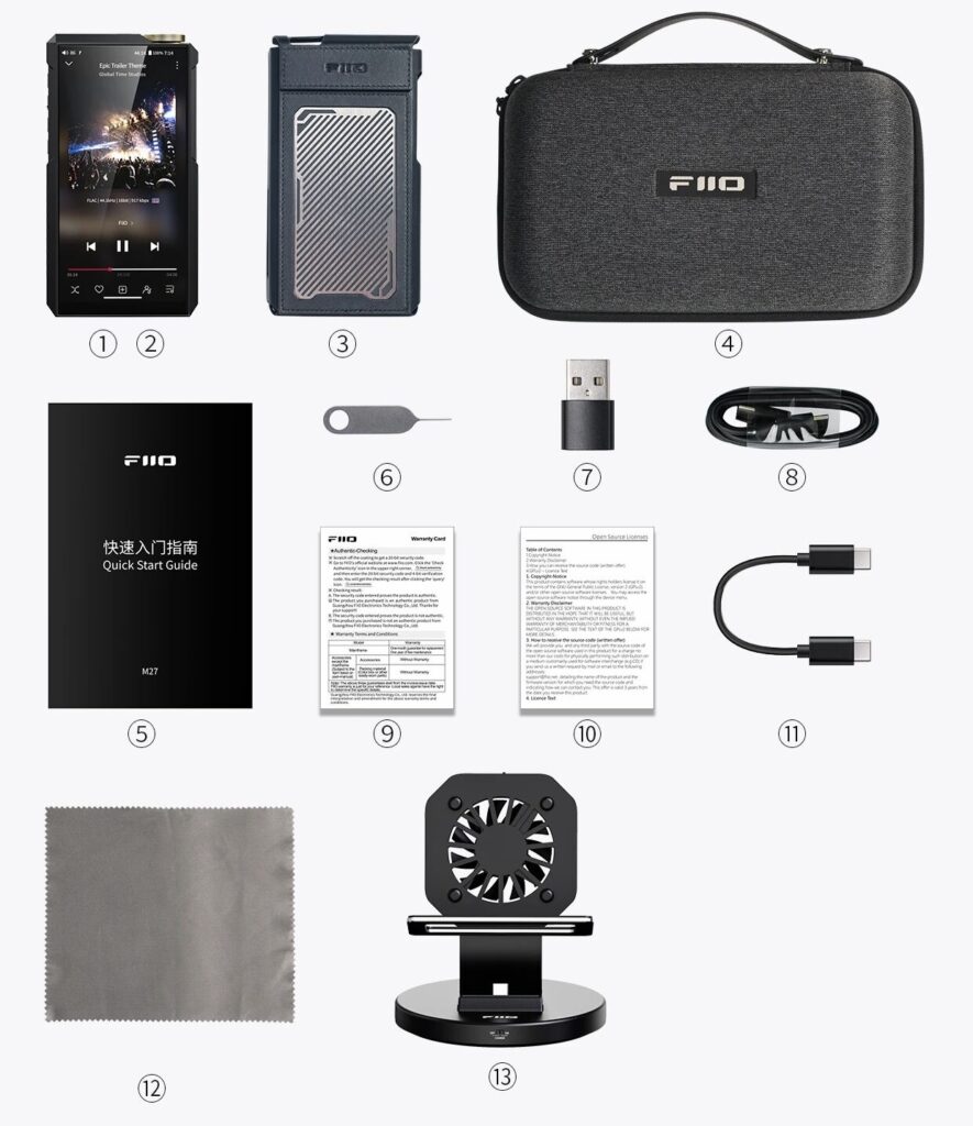 M27には、放熱レザーケース、冷却スタンドDK1 PLUS、専用保護キャップ、そしてリネン調の高級キャリングケースが付属。放熱と保護、そして収納性までトータルにデザインされ、どんな環境でも最高のHiFi体験を提供します。