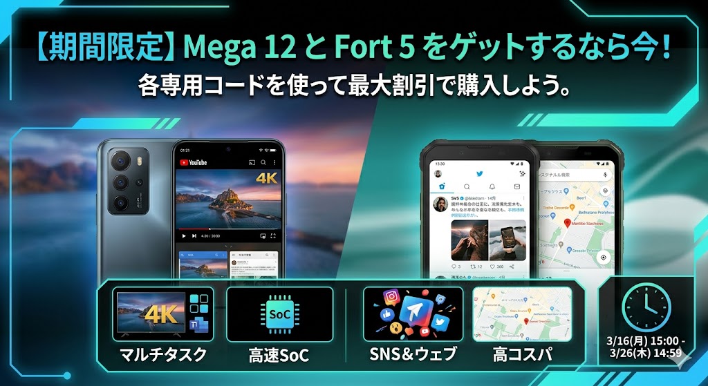 今回ピックアップするのは、頑丈さと高いコストパフォーマンスで絶大な人気を誇るブランド「Blackview(ブラックビュー)」の2製品、**「MEGA 12」「FORT 5」**です。 3月16日(月)15:00 から 3月26日(木)14:59 までの期間中、専用のプロモーションコードを利用することで、通常価格から大幅なプライスダウンが実現します。